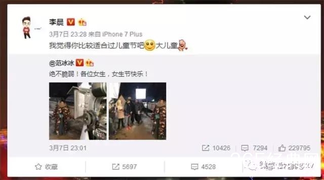 刚刚过去的三八女神节,范冰冰在微博晒出照片并写道:“绝不脆弱!各位女生,女生节快乐! ”范冰冰穿着萌萌的衣服,围着可爱的围巾,拿着暖水袋。随后,李晨即转发微博,毫无防备的撒了一把狗粮:“我觉得你比较适合过儿童节吧,大儿童。”随后网友纷纷说“你有本事秀恩爱,你有本事快结婚呐”