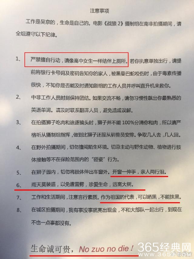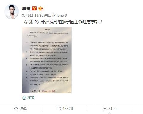 近日,吴京在微博上发布了一条微博,内容是关于《战狼2》拍摄时的注意事项。普通的注意事项没什么好在意的,但是他的这些事项中“条条段子上热搜”啊~