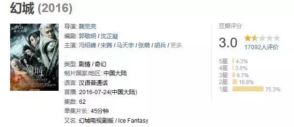 虽然在《狼图腾》之后,冯绍峰的电视剧和电影评分呈蹦极的趋势下滑,但好歹有一部3.0的幻城在前,总不会再来一个触底的吧?▼▼▼