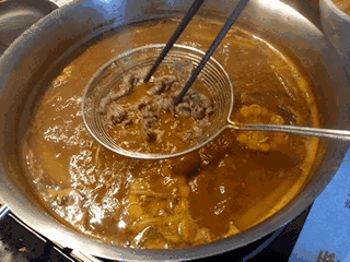 牛排已经是熟的,汤沸腾后,只需要加入锅内煮一下就可以吃了。