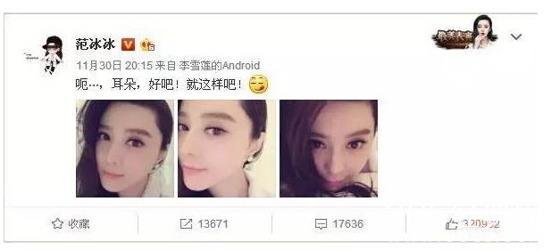 因为耳朵竟然一下子上了热搜第一了,范冰冰还特意发了微博,呃…耳朵,好吧!就这样吧!