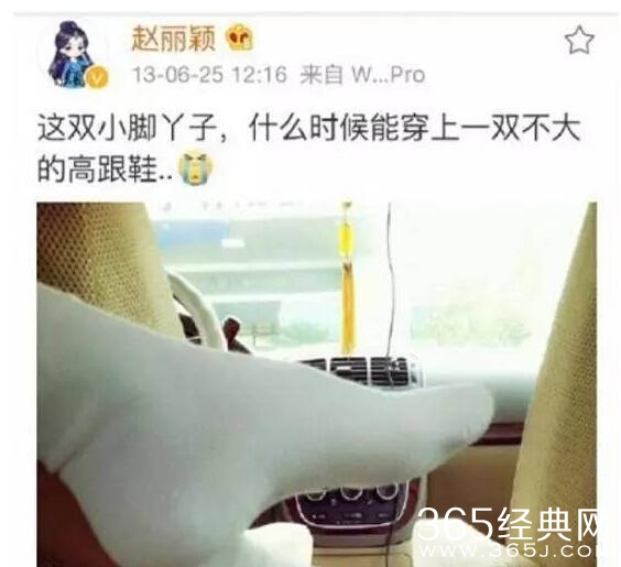 赵丽颖的小脚丫,这不是一次被调侃了,赵丽颖13年的时候就发过一条微博:这双小脚丫子,什么时候能穿上一双不大的高跟鞋。