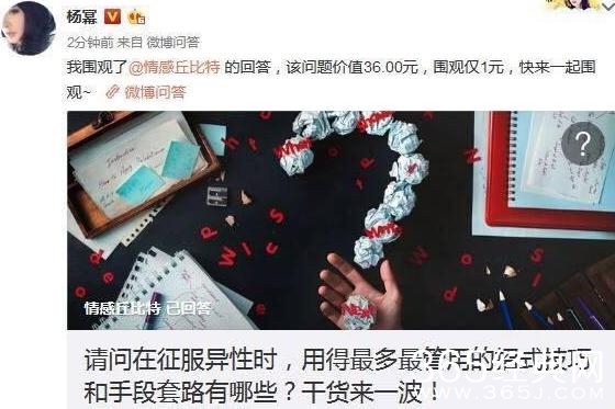 而前几日,杨幂更新了一条关于围观了@情感丘比特 的问答:请问在征服异性时,用得最多最管用的招式技巧和手段套路有哪些?干货来一波!该微博一出,众多网友都惊呆了:大幂幂原来就是“撩汉高手”,怎么现在还看起撩汉技能来?