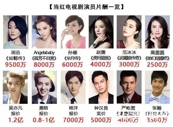 这几年,电视剧圈更新换代很快,尤其是IP被鼓吹,大量资本融入电视圈,演员的片酬只增不减。就拿李易峰来说吧,2015年他接演电视剧《麻雀》,片酬已经达到了2600万。两年过后,网传其电视剧片酬已翻了一番。吴亦凡更是报价1.2亿。此外,有消息称《如懿传》的两位主演周迅、霍建华片酬高达1.5亿元。
