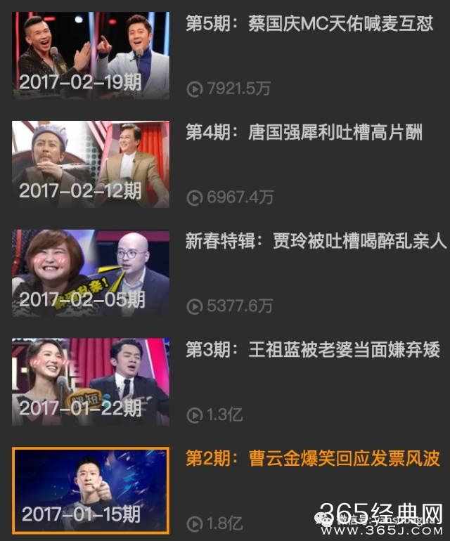综合收视率来看,除了开播第一期之外,点击率最高的就是曹云金出场的这一期,有1.8亿。
