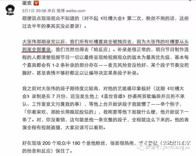 其实这不是大张伟第一次上《吐槽大会》,之前在第一季就上过(但当时节目下架之后并没有播出来),当时和他同一期的还有梁欢、白凯南等人。梁欢就在微博上爆料过,当时的那一期节目也是重录过的