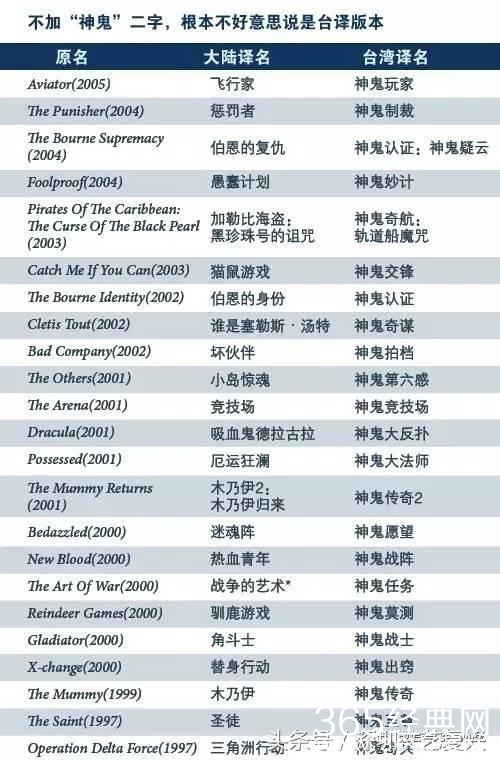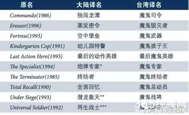 类似“神鬼”系列的,台湾人还有“专人专名”系列的电影译名,比如施瓦辛格专用的是“魔鬼系列”。