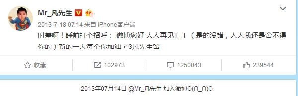 2013年加入微博的吴亦凡,第一条内容就是告别过去(人人)迎接新生活(微博),在表情包还没流行起来的时候,这样的颜文字还是很萌哒