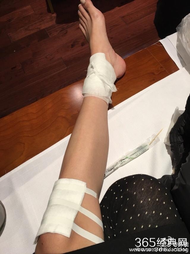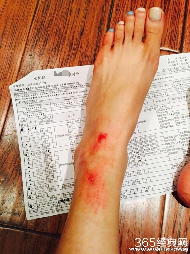 这是谁的脚呢?看水印就知道了。车晓的脚因为摔下楼梯所以伤成了这样~但是这个不是因为工作啦,只是顶着这种伤还要拍戏的话,那可能就有点可怜了吧?