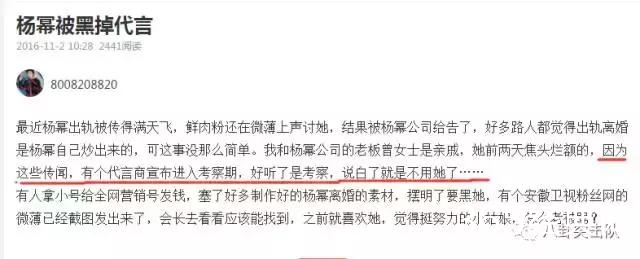 因为离婚传闻,杨幂有个代言商宣布进入考察期,好听了是考察,说白了就是不再用她了···
