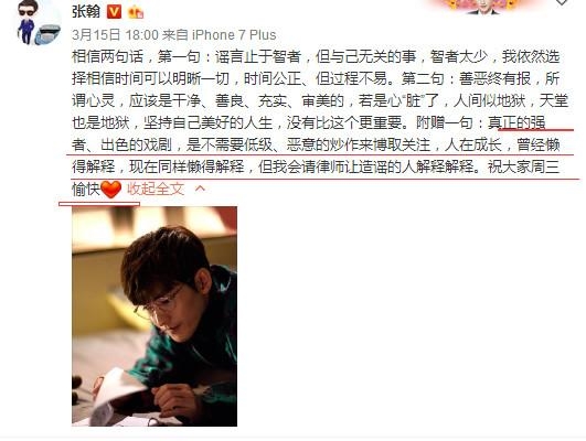 3月15日是打假日,张翰也为自己进行了打假。晚上6点张翰在微博中更新一条动态:相信两句话,第一句:谣言止于智者,但与己无关的事,智者太少,我依然选择相信时间可以明晰一切,时间公正、但过程不易。第二句:善恶终有报,所谓心灵,应该是干净、善良、充实、审美的,若是心“脏”了,人间似地狱,天堂也是地狱,坚持自己美好的人生,没有比这个更重要。附赠一句:真正的强者、出色的戏剧,是不需要低级、恶意的炒作来博取关注,人在成长,曾经懒得解释,现在同样懒得解释,但我会请律师让造谣的人解释解释。