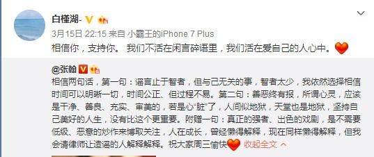 此外,作为著名80后的小说家白槿湖也在微博中支持张翰并配文写道:相信你,支持你。 我们不活在闲言碎语里,我们活在爱自己的人心中。