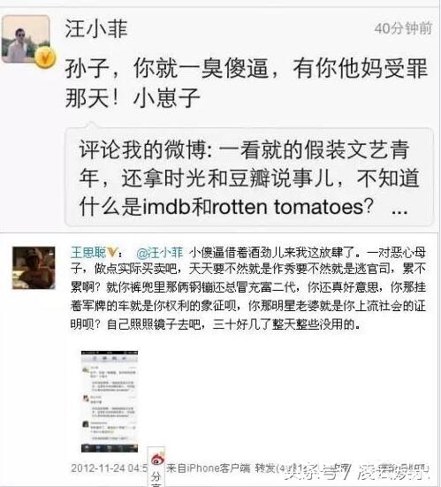 王思聪在微博上手撕范冰冰,认为其一无是处,称范冰冰没有作品、没有演技。主要靠雇来的水军炒作绯闻成名。范冰冰不甘示弱立刻给予回击:你找你的爹,我干我的活,咱们都算自强不息,讽刺王思聪靠爹王思聪骂过的明星数不胜数。王思聪的回应更是让人惊掉下巴!