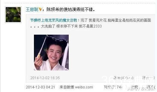 大家知道,陈妍希自从演过《神雕侠侣》里的小龙女以后,饱受网友吐槽。很多人称毁三观,玷污了自己童年心目中小龙女的形象。娱乐圈纪检委王思聪自然不会放过这个话题。犀利的称:陈妍希在《神雕侠侣》中饰演的不是小龙女而是傻姑,让人听后哭笑不得。