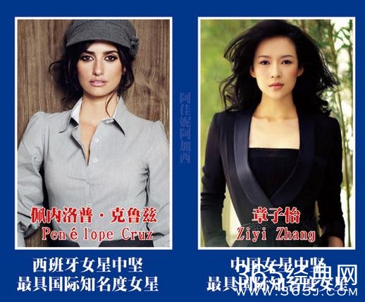 章子怡和佩内洛普·克鲁兹分别代表中国和西班牙最具国际知名度的女星。都是商业和文艺兼顾的演员兼明星。并且都成名较早,都是小脸美女,可妖艳可清纯可霸气的。都获得过奥斯卡最佳外语片。