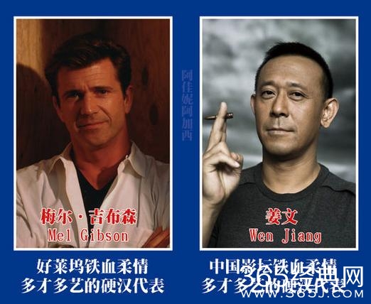 姜文和梅尔·吉布森都是硬汉演员代表,极具阳刚之气。两人都是个性十足的演员兼导演,很有想法并且都十分成功,甚至可以说说导演比演员更成功,姜文 的《阳光灿烂的日子》和《让子弹飞》,梅尔吉布森的勇敢的心