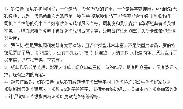 德尼罗难得的业内加影评人加观众都评价好受众广的演员,发哥国内其实也一样,很多人最多满足两项