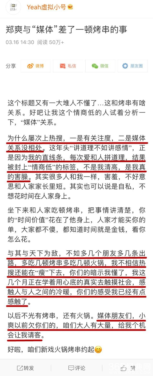 今日,郑爽在微博发布一篇题为《郑爽与“媒体”差了一顿烤串的事》的长微博,解释了为何屡上热搜。
