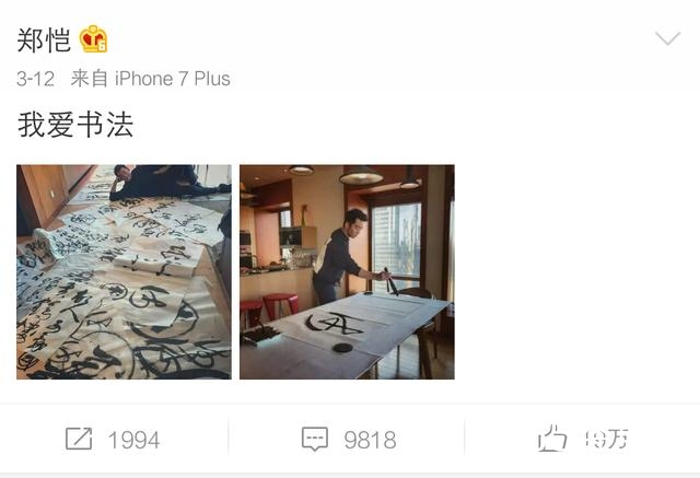 郑恺微博写道“我爱书法”并附上照片,有媒体报道此举是在为张艺谋的新戏作准备。