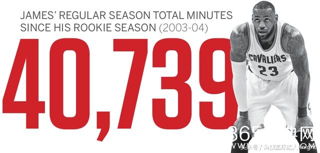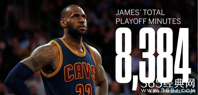 生涯至今詹姆斯已出战199场季后赛。按照场均37.7分钟计算,那几乎是多打了2.7个常规赛赛季。而他的季后赛总出战时间要多于凯文-杜兰特、斯蒂芬-库里与德雷蒙德-格林三人季后赛出战时间的总和。