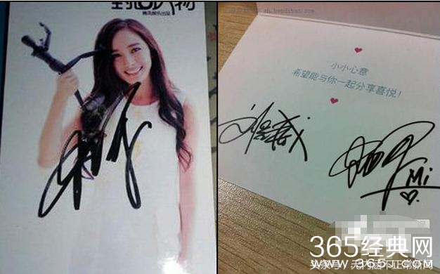 左边是杨幂的签名照,除了照片上的她之外,我认不出有任何杨幂的痕迹;而右边则是杨幂结婚的喜糖附赠卡,上面的前面更潦草了,不过加了mi跟一棵爱心,至少能认出点。