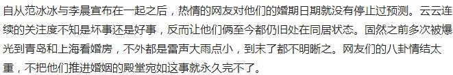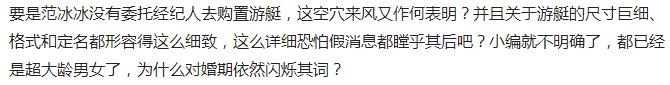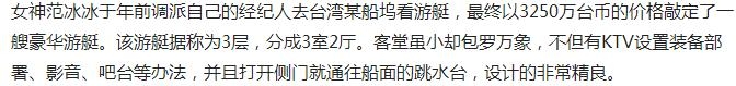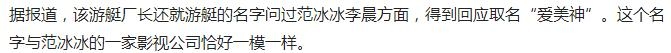 据这位自称是范爷经纪人的男子说,范冰冰买这艘游艇是为了和李晨举行婚姻那天用的,之所以出手阔绰花三千万买游艇是为了到时候将请一众圈中挚友到场他们的海上浪漫婚礼,而这个游艇便是为婚礼准备的。但是随后有记者采访了范冰冰的经纪人,询问游艇一事,但是想不到却被一口否定,称不知道这件事情,更不知婚礼的情况。