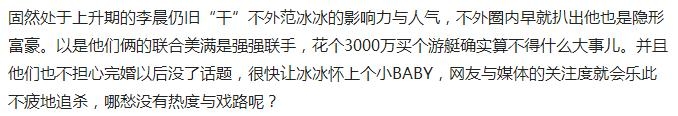 其实真要说起来,游艇买不买倒是无所谓,要害的问题照旧范冰冰早点给李晨怀一个娃,想别的一线女星那样子未婚先孕完婚,这样范冰冰才不至于嫁得很低调,祝福他们两个,明知会在一起的两人已经忍不住了多久了,提前把祝福献上。