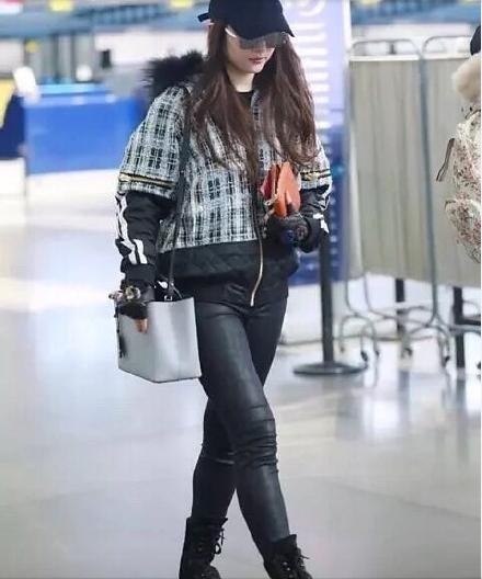 下面这张是刘亦菲机场私服,大大的格纹拼接夹克下面,搭了一条紧身皮裤和系带,感觉好紧...