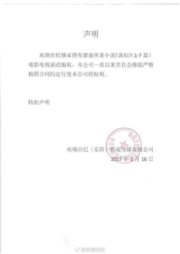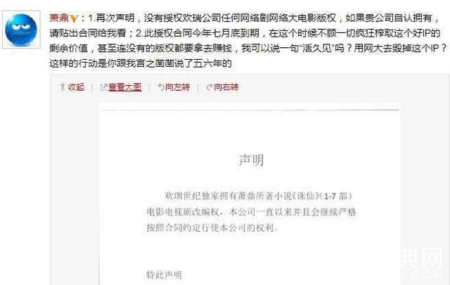 就在众说纷纭之时,欢瑞公司发表了声明称“欢瑞公司享有《诛仙》全部的电影电视剧改编权”态度十分之强硬,硬肛了萧鼎一波。