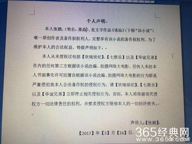 就在不久前《诛仙》小说而原作者萧鼎在微博发表声明,称“欢瑞世纪、华谊兄弟七娱乐等公司并没有小说改编、拍摄网络大电影的权利”