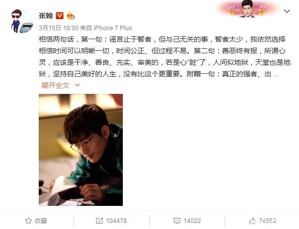 20170306日,张翰更新微博,称:相信两句话,第一句:谣言止于智者,但与己无关的事,智者太少,我依然选择相信时间可以明晰一切,时间公正、但过程不易。第二句:善恶终有报,所谓心灵, 应该是干净、善良、充实、审美的,若是心“脏”了,人间似地狱,天堂也是地狱,坚持自己美好的人生,没有比这个更重要。附赠一句:真正的强者、出色的戏 剧,是不需要低级、恶意的炒作来博取关注,人在成长,曾经懒得解释,现在同样懒得解释,但我会请律师让造谣的人解释解释。祝大家周三愉快。