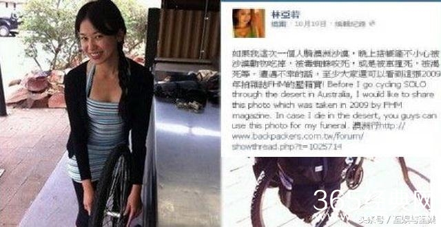 林亚若是台湾美女作家,曾当过7年空姐,十分喜欢旅游,之后转行当旅游作家,经常出任电视节目嘉宾,大谈旅行经验。在2013年准备去澳洲沙漠旅游,在出发前,在社交网站发文:“在独自挑战自行车穿越澳洲沙漠之前,我与大家分享这张2009年为杂志拍摄的压箱宝。如果我在沙漠遭遇不幸的话,我的葬礼可用这张照片。”没想到一语成谶,在澳洲沙漠旅行时因车祸身亡,年仅31岁。