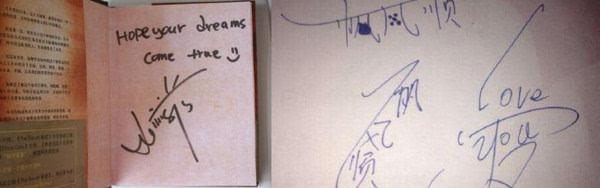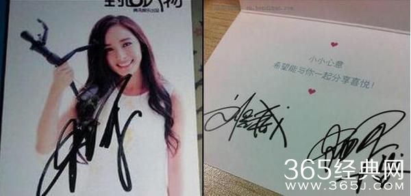 杨幂的署名也是出了名的艺术,这个名字要不是签在她的照片上,谁晓得写的啥,却是刘恺威的署名能够轻松认进去,只是两人的署名放在一起比较,杨幂的字体真的太潦草了,只能看下方的MI字才猜得出这是杨幂的署名。
