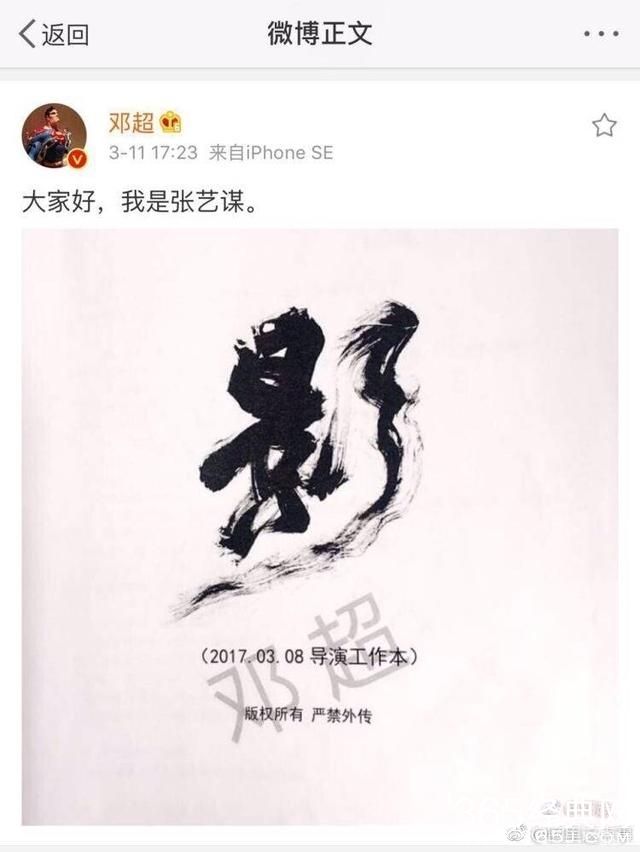 此前邓超也晒出一张导演工作剧本名为《影》,并写道“大家好,我是张艺谋”,透露加盟张艺谋这部新片。这位“喜剧咖”第一次主演张艺谋新片,让人期待两人的火花。