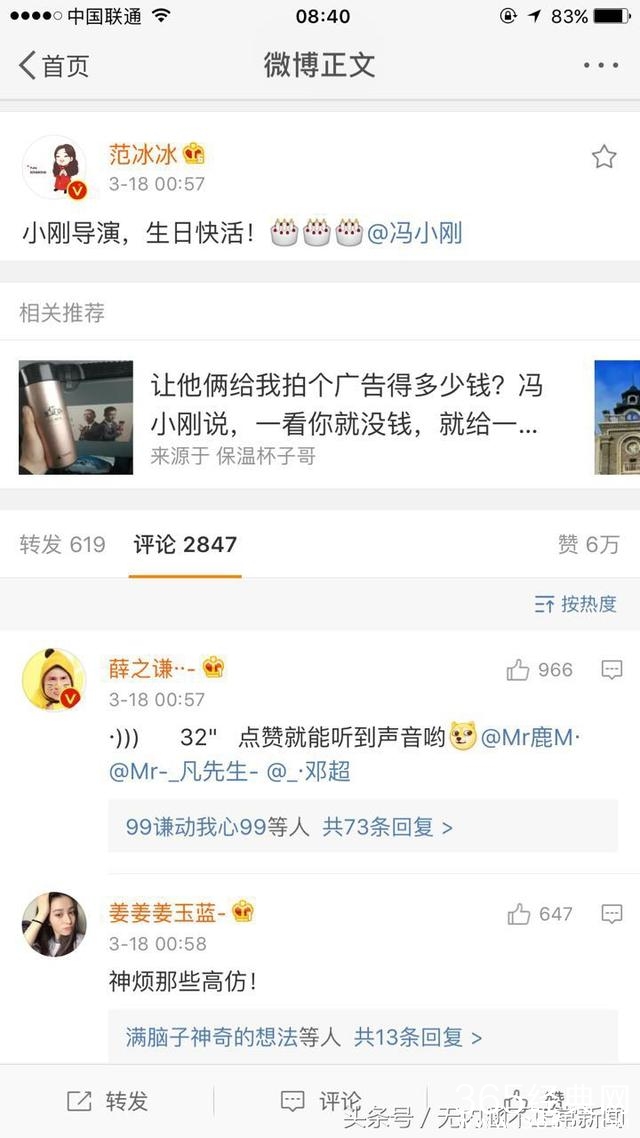 范冰冰微博发文祝福冯小刚“小刚导演,生日快活”