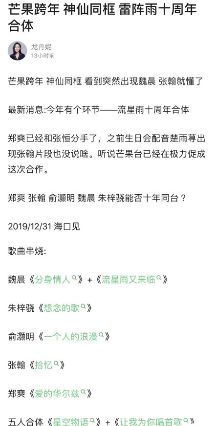 网友爆料湖南卫视跨年流星雨十周年合体!翰爽同台,还有H4歌曲串烧,神仙同框啊。